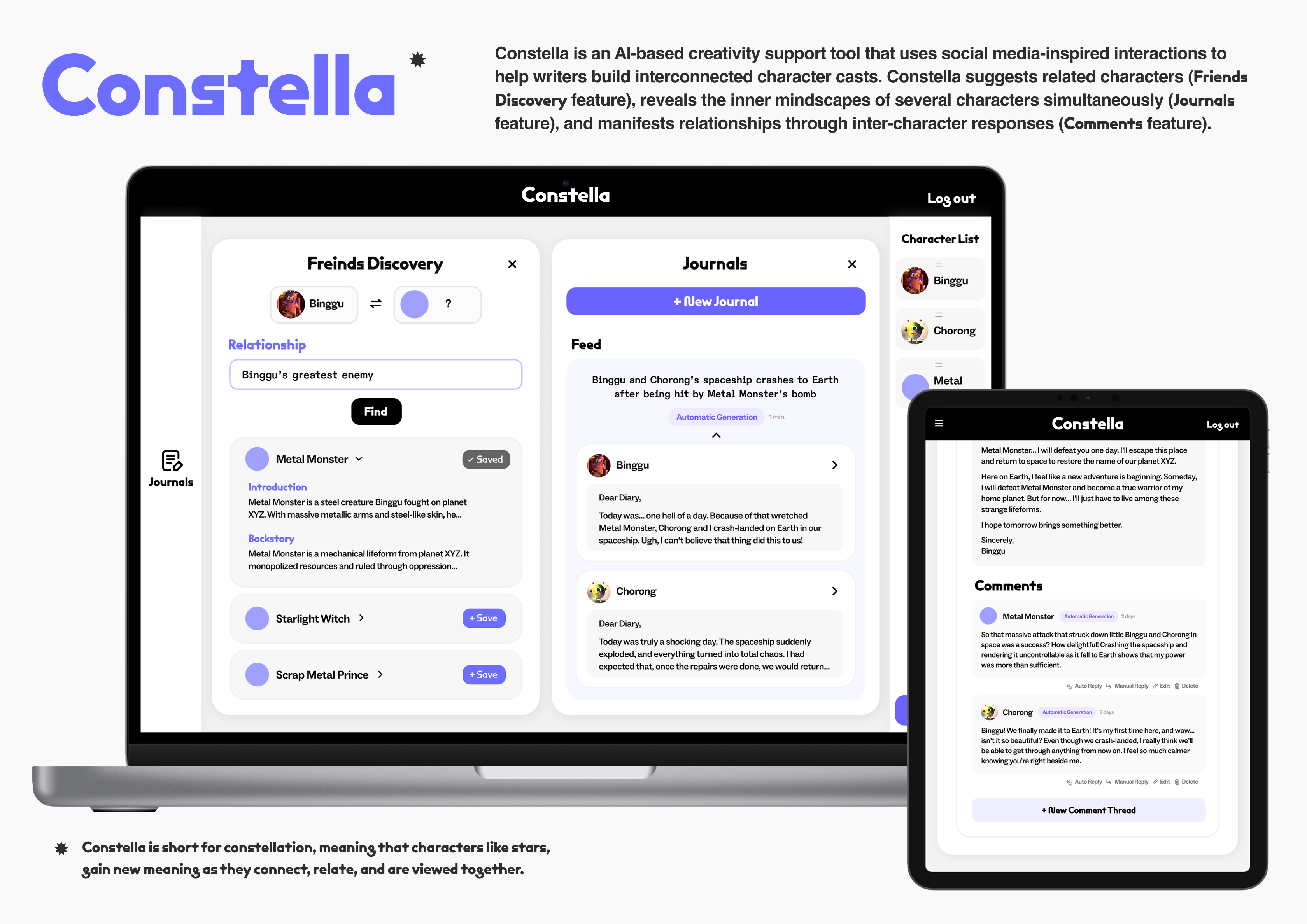 Creating a cast of characters by attending to their relational dynamics is a critical aspect of most long-form storywriting. However, our formative study (N=14) reveals that writers struggle to envision new characters that could influence existing ones, to balance similarities and differences among characters, and to intricately flesh out their relationships. Based on these observations, we designed Constella, an LLM-based multi-agent tool that supports storywriters' interconnected character creation process. Constella suggests related characters (FRIENDS DISCOVERY feature), reveals the inner mindscapes of several characters simultaneously (JOURNALS feature), and manifests relationships through inter-character responses (COMMENTS feature). Our 7-8 day deployment study with storywriters (N=11) shows that Constella enabled the creation of expansive communities composed of related characters, facilitated the comparison of characters' thoughts and emotions, and deepened writers' understanding of character relationships. We conclude by discussing how multi-agent interactions can help distribute writers' attention and effort across the character cast.